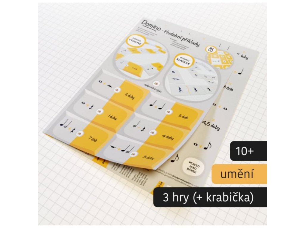 Pri hre s výukovým dominom deti tvoria hada, kedy prikladajú „odpovede na otázky“. V tomto prípade notový zápis k textu (výška + dĺžka noty). Využijú ho teda deti so záujmom o hudobnú tému vo veku zhruba od 10 rokov. Klasické domino si užijú hráči rôzneho veku. Môžete tak zapojiť do hry aj malých nenechavých súrodencov. Pravidlá veľmi jednoduché a sú súčasťou štvorlistu. Pexeso potom dopĺňa trojicu hier, kedy opäť riešite hľadanie správnej dvojice. Ale sťažené o nutnosť zapojiť ešte svoju pamäť. Pre domino si môžete navyše podľa návodu vytvoriť originálnu krabičku, ktorá je súčasťou grafiky dvojlistu.