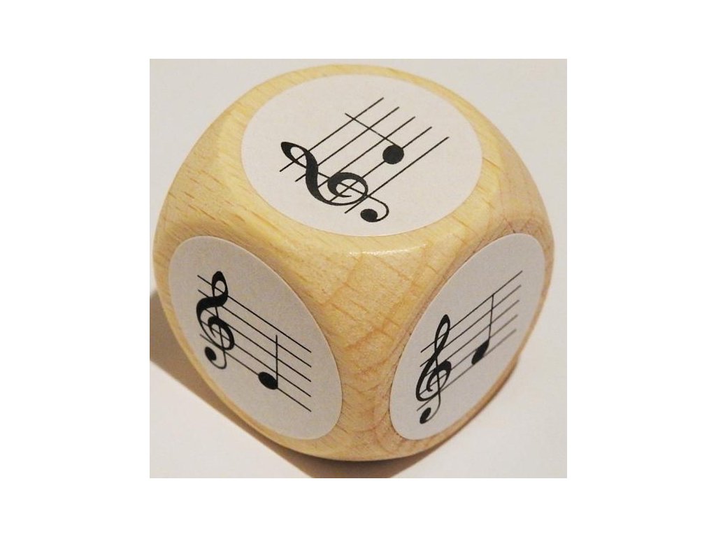 Drevená kocka s notami v husľovom kľúči c1, d1, e1, f1, g1, a1. Veľkosť 25 mm.