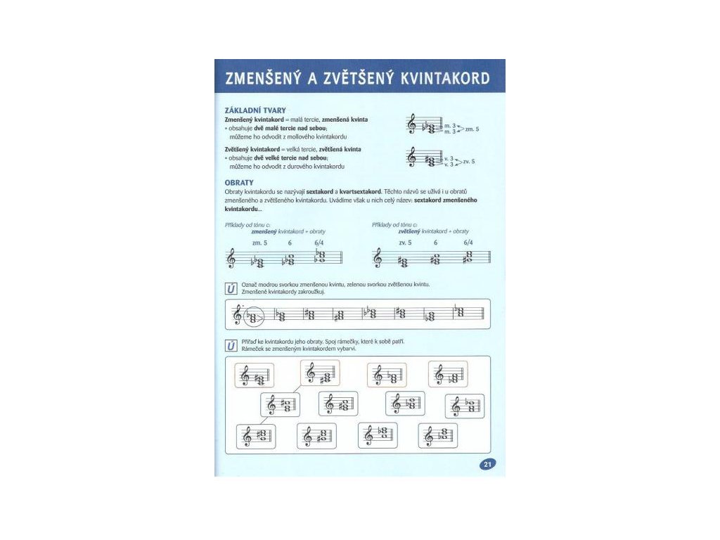 Základné rozdelenie stupníc; Diatonické stupnice; Moderné stupnice durovej a molovej; Staré = cirkevné stupnice; Chromatická a celotónová stupnica; Zvláštne stupnice; Tónina, akord; Akordy a ich rozdelenie; Durový a mollový kvintakord; Zmenšený a zväčšený kvintakord; Septakordy a nónový akord; Prehľad základných tvarov akordov; Akordické značky; Obraty akordov; Akordické značky obratov akordov; Základy harmónie; Harmonizácia melódie; Hudobné pojmy v harmónii; Hudobné názvoslovie; Tempo; Artikulácia; Hudobný výraz, technika hry; Dynamika, Melodické ozdoby; Značky na opakovanie; Hudobné odbory.