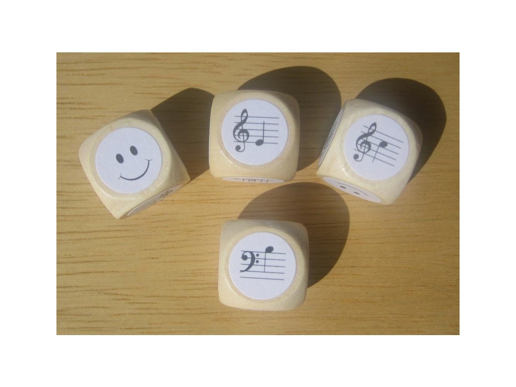 - 5 kociek z prírodného dreva so zaoblenými hranami (zo svetlého bukového dreva, s dĺžkou hrany 16 mm), polepené 6 potlačenými štítkami (s notami c1, d1, e1, f1, g1 a1, h1 a sa dvoma smajlíkmi)