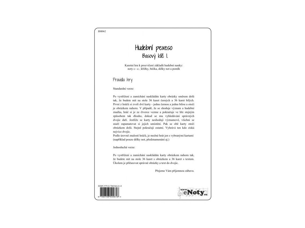 Naučte sa noty v basovom kľúči príjemne, ľahko a zábavne s týmto skvelým pexesom! Pexeso obsahuje 72 herných kartičiek (36 dvojíc) so základmi hudobnej náuky: noty c - c1, noty s krížikmi a bé, dĺžky nôt a pomlk. Súčasťou pexesa je aj stránka na ktorej sú uvedené správne odpovede, pravidlá hry a rôzne kombinácie hry. Prajeme Vám príjemnú zábavu!