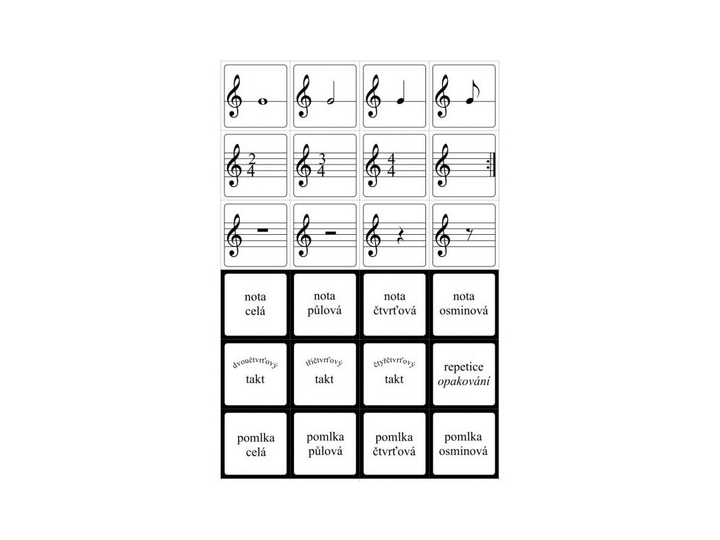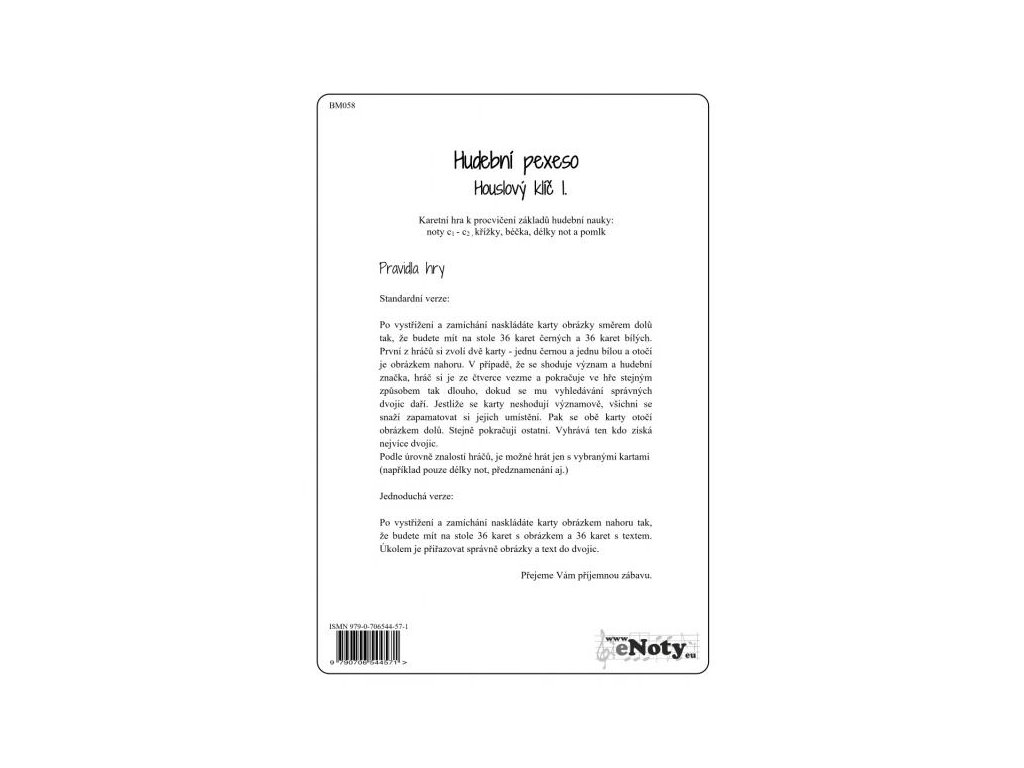 Naučte sa noty v husľovom kľúči príjemne, ľahko a zábavne s týmto skvelým pexesom! Pexeso obsahuje 72 herných kartičiek (36 dvojíc): noty c1 - c2, noty s krížikmi a bé, dĺžky nôt a pomlk. Súčasťou pexesa je aj stránka na ktorej sú uvedené správne odpovede, pravidlá hry a rôzne kombinácie hry. Prajeme vám príjemnú zábavu!