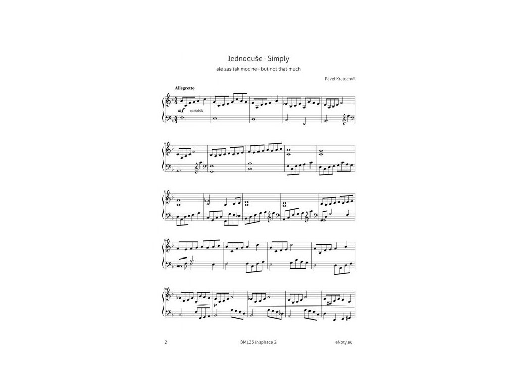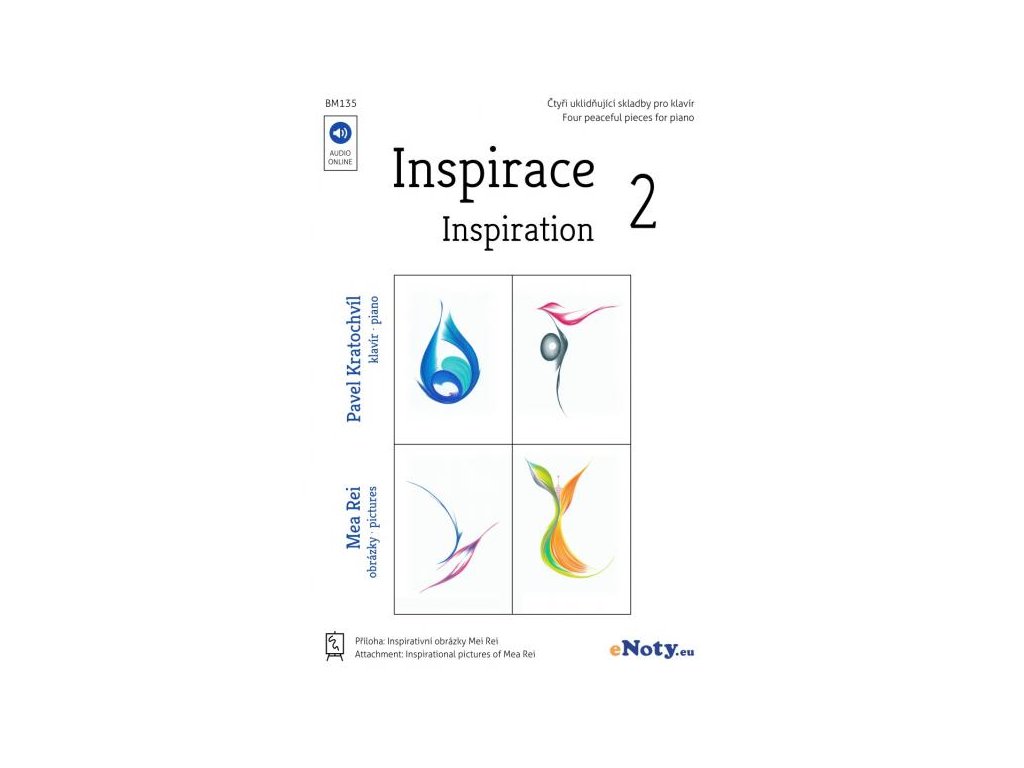 Titul Inšpirácia 2 je ďalšia kolekcia štyroch príjemných a upokojujúcich klavírnych miniatúr a krásnych obrázkov, ktoré pre tieto miniatúry boli inšpiráciou. Obrázky nakreslila výtvarníčka Mea Rei a sú do zošita vložené ako samostatná príloha, aby ste si mohli obrázky, rovnako ako skladateľ Pavel Kratochvíl, položiť na klavír a vychutnať si neobvyklé spojenie melódie a obrazu. A keď sa Vám obrázky budú naozaj páčiť, môžete si ich tiež zarámovať a zavesiť na stenu, napríklad nad klavír, aby ste ich mali pri hraní vždy na očiach. :)