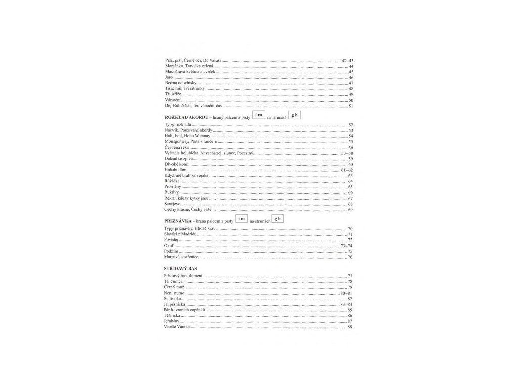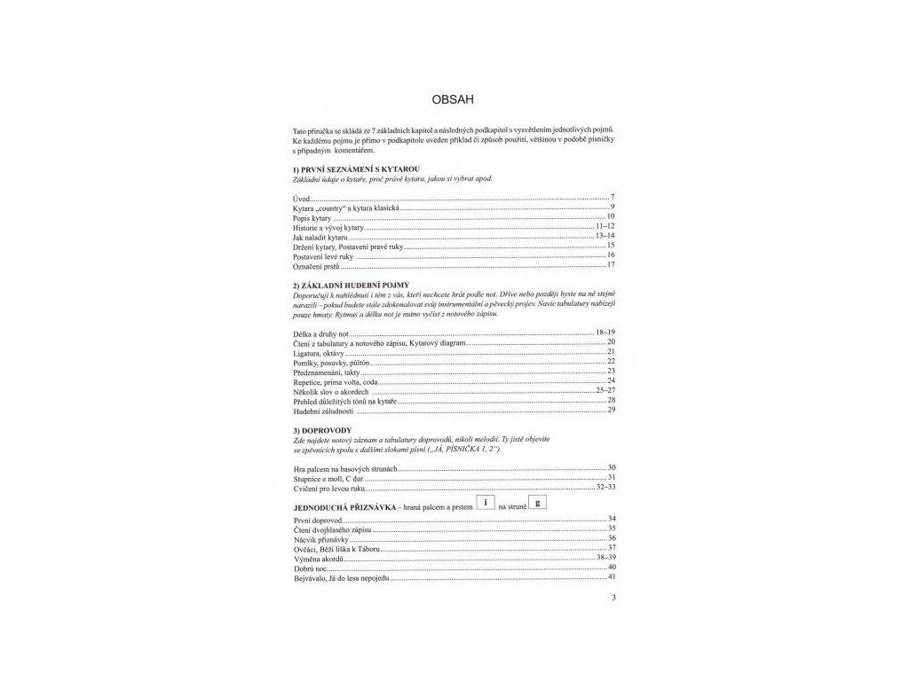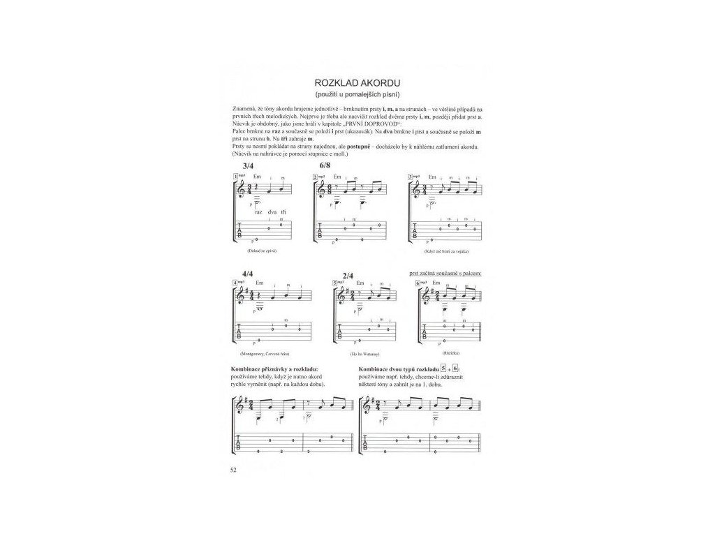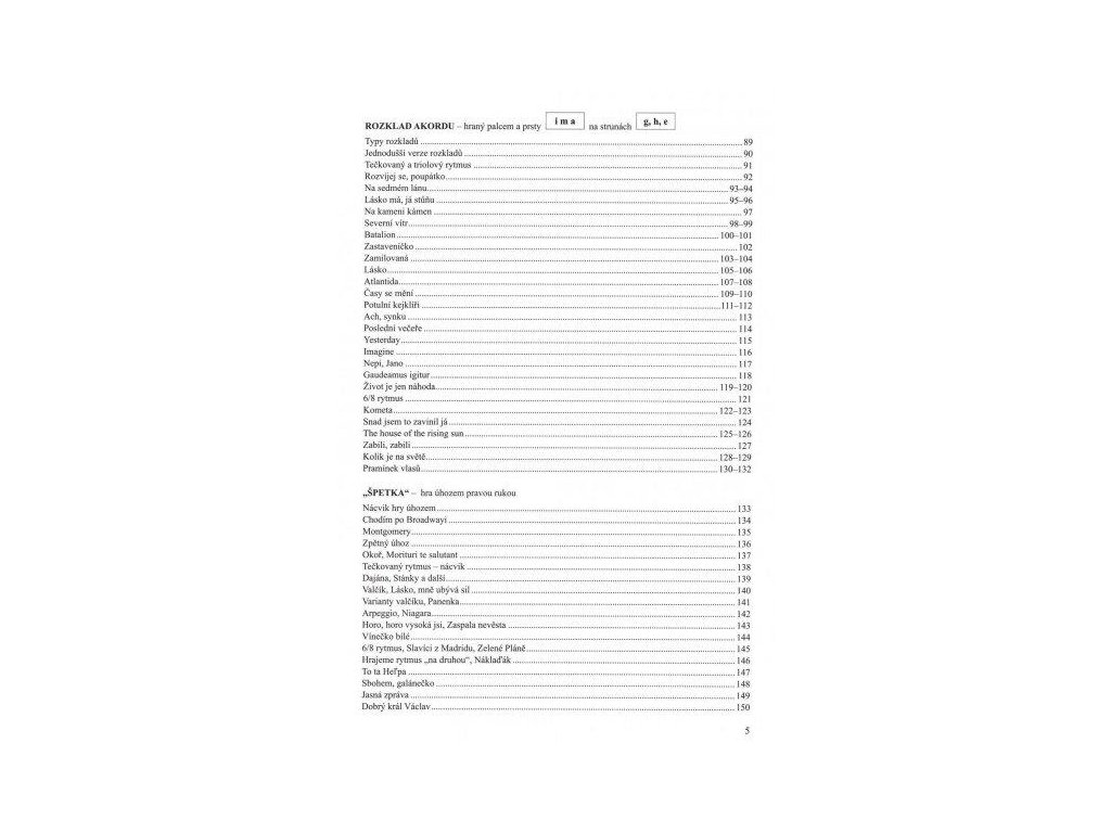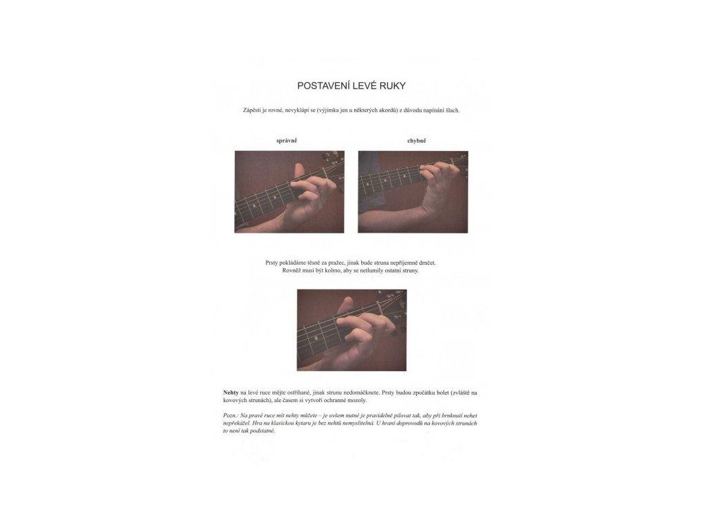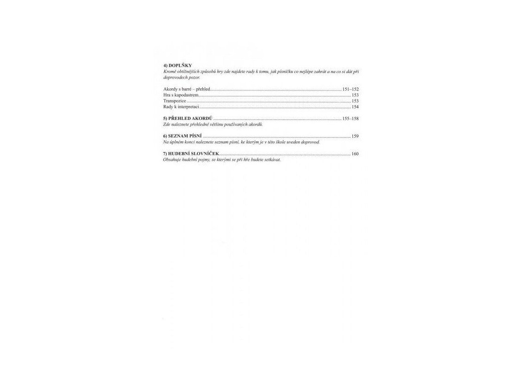 Gitarová škola, ktorá umožní každému záujemcovi zahrať si jednoduchý sprievod k svojim obľúbeným pesníčkam. Metóda výučby je založená na zjednodušených akordoch, ktoré sa hrajú iba na niekoľkých strunách, preto môžu začať so sprievodmi aj mladšie deti, ktorých ruka ešte neobsiahne celý hmatník. Technika hry je postupne obohacovaná ďalšími tónmi a gitarista sa tak dostáva plynulo k vybrnkávaniu všetkými prstami ak celým akordom. Ďalšou nadväzujúcou technikou je rytmická hra úderom pravej ruky - sú tu uvedené základné a najpoužívanejšie rytmy. Kniha obsahuje cez 90 piesní ak nim vypracované sprievody a tiež slovníček hudobných pojmov. Na obálke titulu sú uvedené www stránky, na ktorých si môžete ku knihe zadarmo stiahnuť inštruktážne nahrávky.