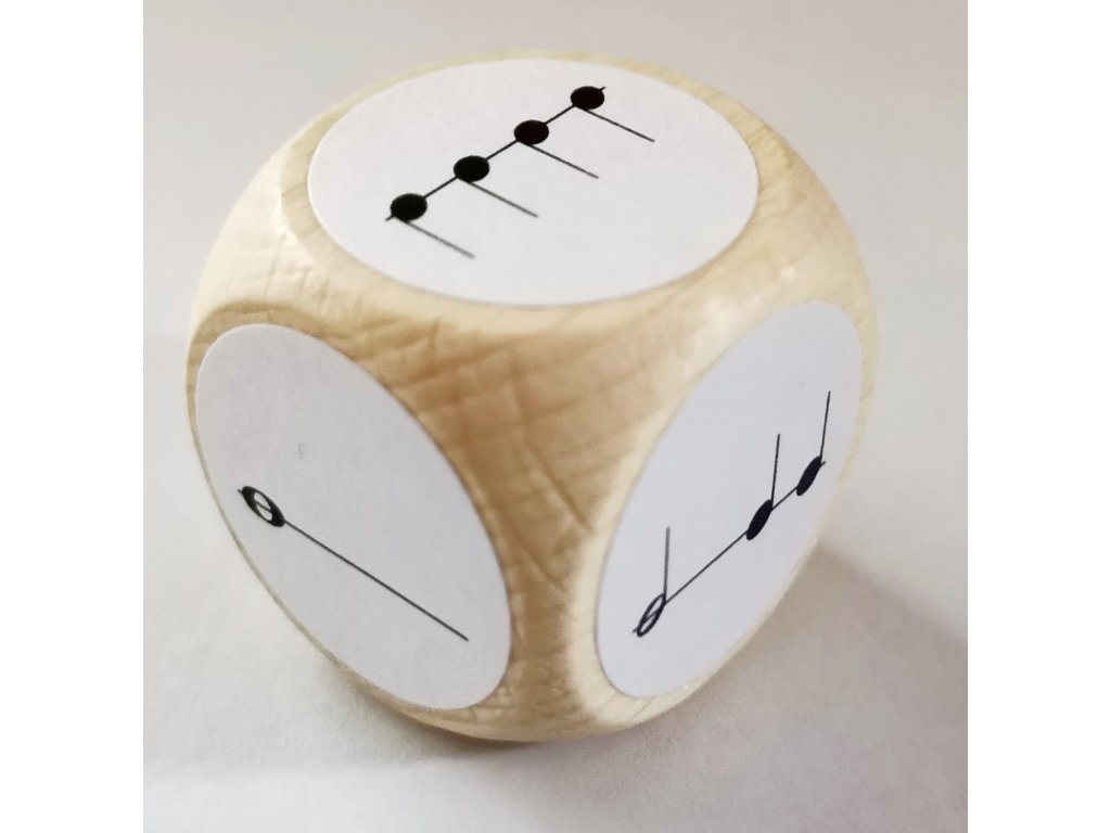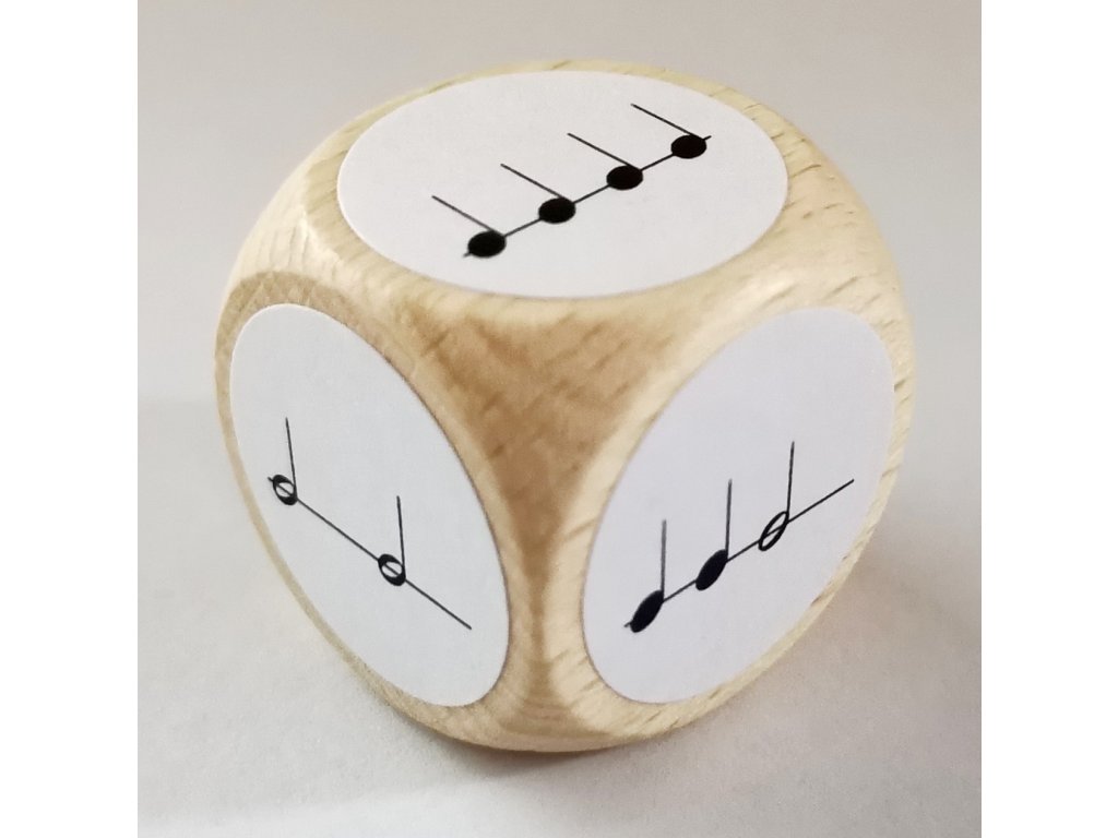Drevená kocka s rôznymi kombináciami štvrťových, polových a celých nôt bez pomlčiek. Veľkosť 25 mm.