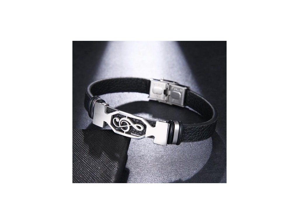 Kožený náramok v čiernej farbe s motívom husľového kľúča. Náramok je možné nastaviť pomocou kovovej spony.