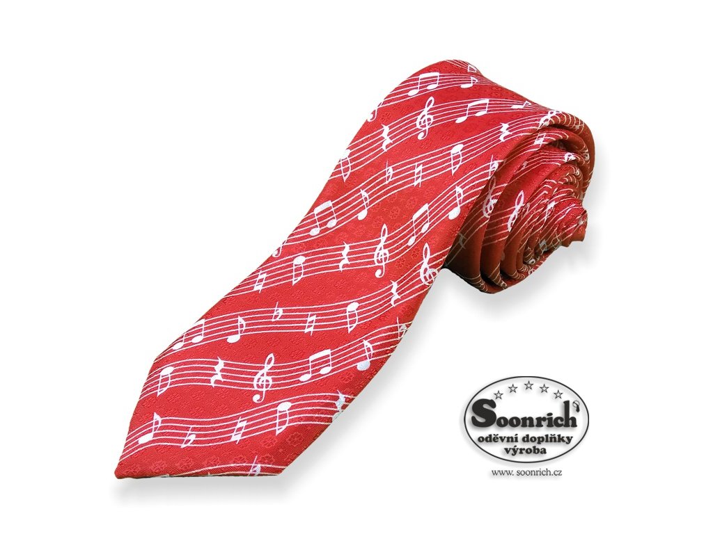 materiál: 100% polyester tkaný, dĺžka: 145 cm, šírka: 6 cm, vzor: nota, noty, notová osnova, husľový kľúč, hudobné motívy, farba: červená, biela,