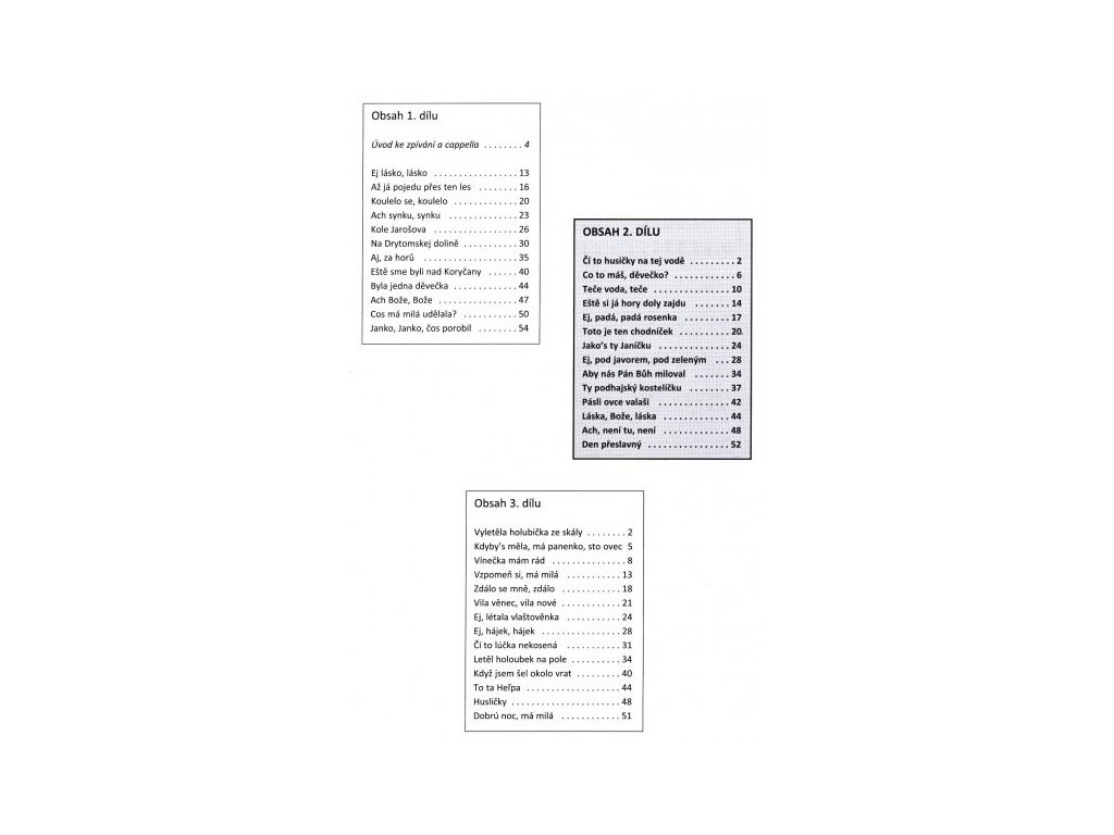 Trojdielny spevník českých ľudových piesní v úprave a cappella (bez sprievodu) vhodný pre veľké aj malé vokálne súbory, ktoré majú radi ľudovú hudbu a radi spievajú bez sprievodu hudobných nástrojov. V úvode spievnika je krátke predstavenie akapelového spievania a na niekoľkých stránkach sú tu uvedené základné pravidlá pre spievanie bez sprievodu hudobných nástrojov. K spevákom je priložené CD, na ktorom sú pre Vašu predstavu naspievané tri ľudové piesne, ktoré naspievala vokálna skupina Kriskros Kvintet. Násluch piesní si môžete vypočuť v zozname skladieb, keď kliknete na ikonu reproduktora u vybranej skladby. Ďalej na priloženom CD nájdete súbory všetkých ľudových piesní, ktoré Vám pomôžem pri nácviku jednotlivých skladieb. Všetky piesne upravil známy český zbormajster a aranžér Marek Šlechta (1961).