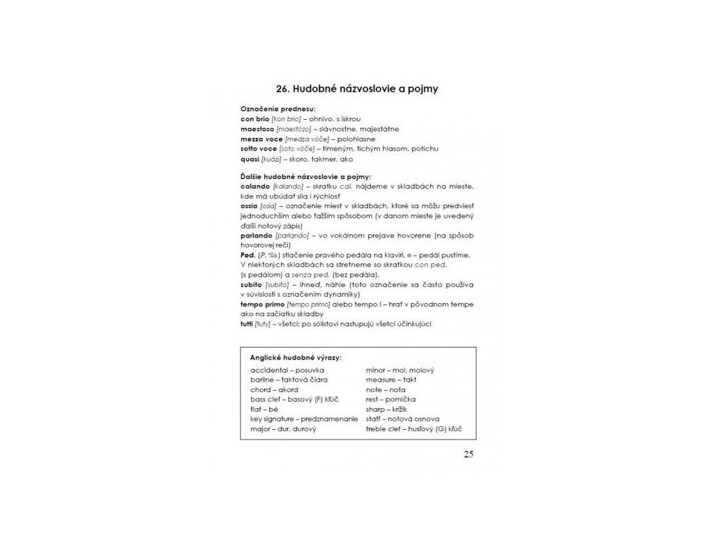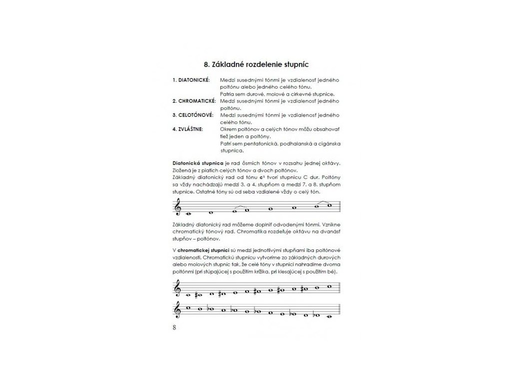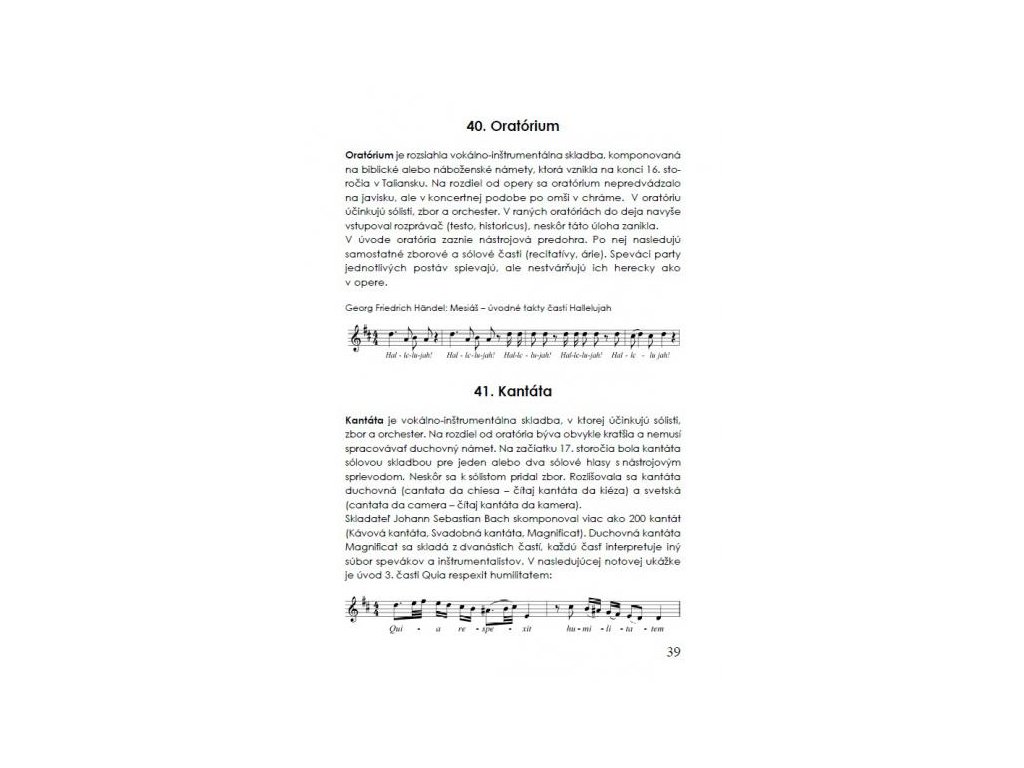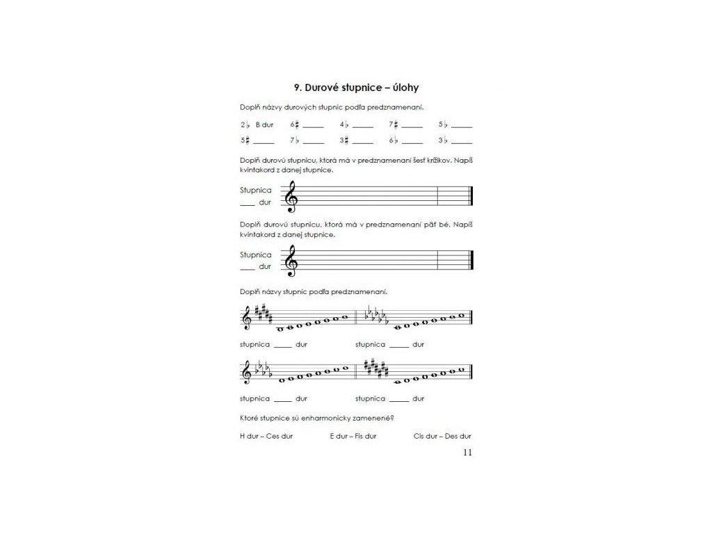 Husľový, altový, tenorový a basový kľúč, dĺžky nôt a ich zoskupenie v taktoch, pravidelné a nepravidelné delenie nôt, enharmonické tóny, stupnica diatonická, stupnica chromatická, celotónová, pentatonická, hlavné a vedľa kvintakordy, kadencia, hudba klasicizmu a romantizmu, skladatelia, hymna Slovenskej republiky, festival Bratislavskej hudobnej slavnosti.