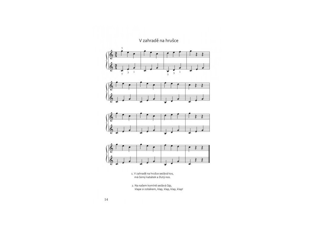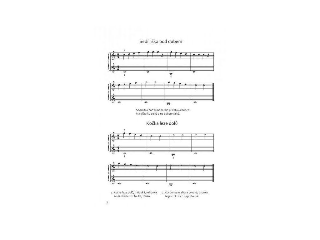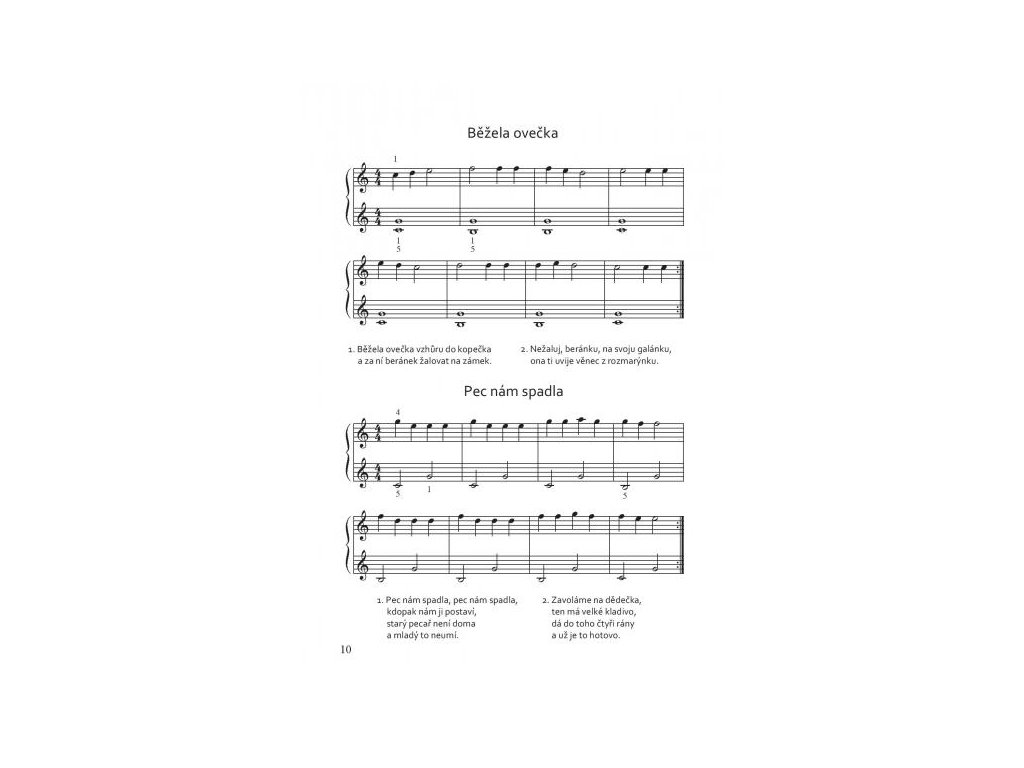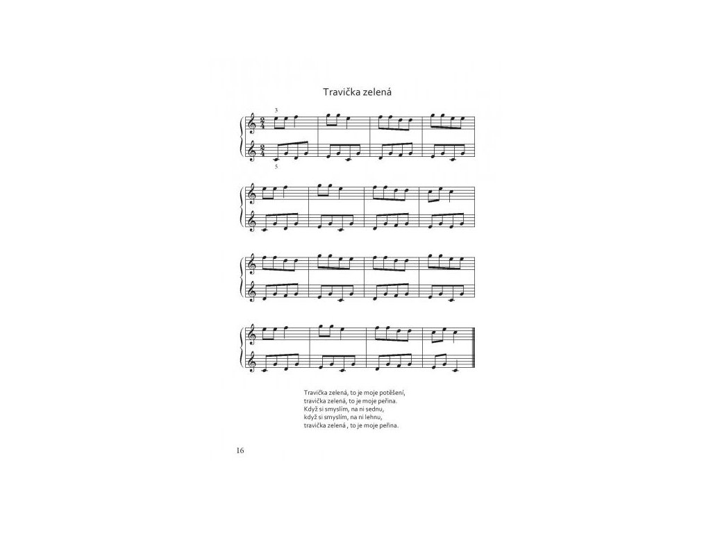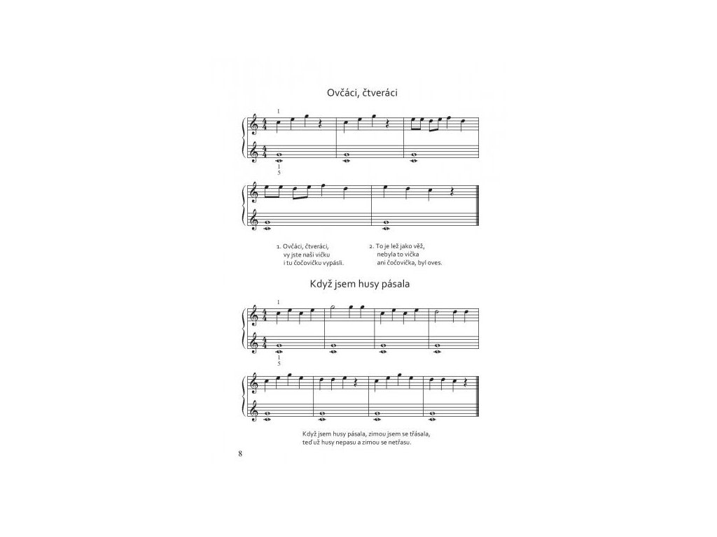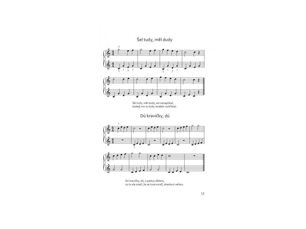 Noty obsahujú 43 ľudových piesní a vánočních kolíed v jednoduchej úprave pre obe ruky. Sú určené pre začínajúcich hráčov a je možné ich využiť ako vhodný doplnok klavírnej hry. Sprievody pre ľavú ruku sa začínajú na jednotlivých tónoch (c – g), následuje hra dvoch tónov súčasne (c – g, h – g) av ďalšej časti sú už rozpísané skupinky tónov (napríklad c – g – e – g, h – g – d – g alebo rozložené akordy c – e – g, h – d – g). Podľa vlastnej potreby je možné sprievody naďalej rozvíjať alebo získané zručnosti využiť v ďalších piesňach. Noty sú určené mladším žiakom (približne 1. - 3. ročník ZUŠ).