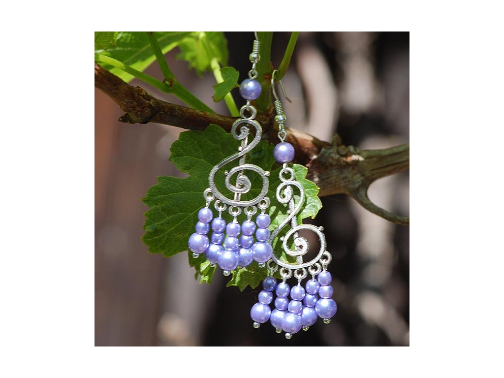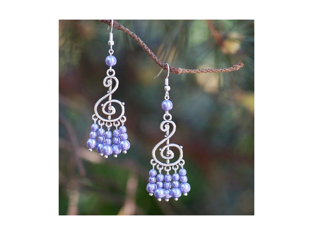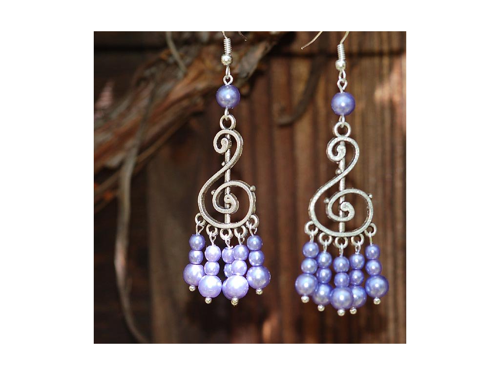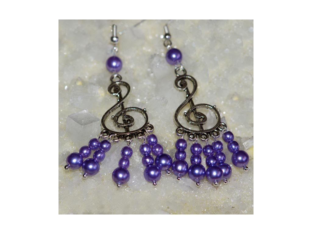 Efektné náušnice v orgovánovom tóne, kovové ramienko v tvare husľového kľúča. Kkovové komponenty z bižutérneho kovu, sklenené korálky voskovky. Dĺžka bez háčika 6 cm. Český výrobok. Bez darčekovej krabičky.