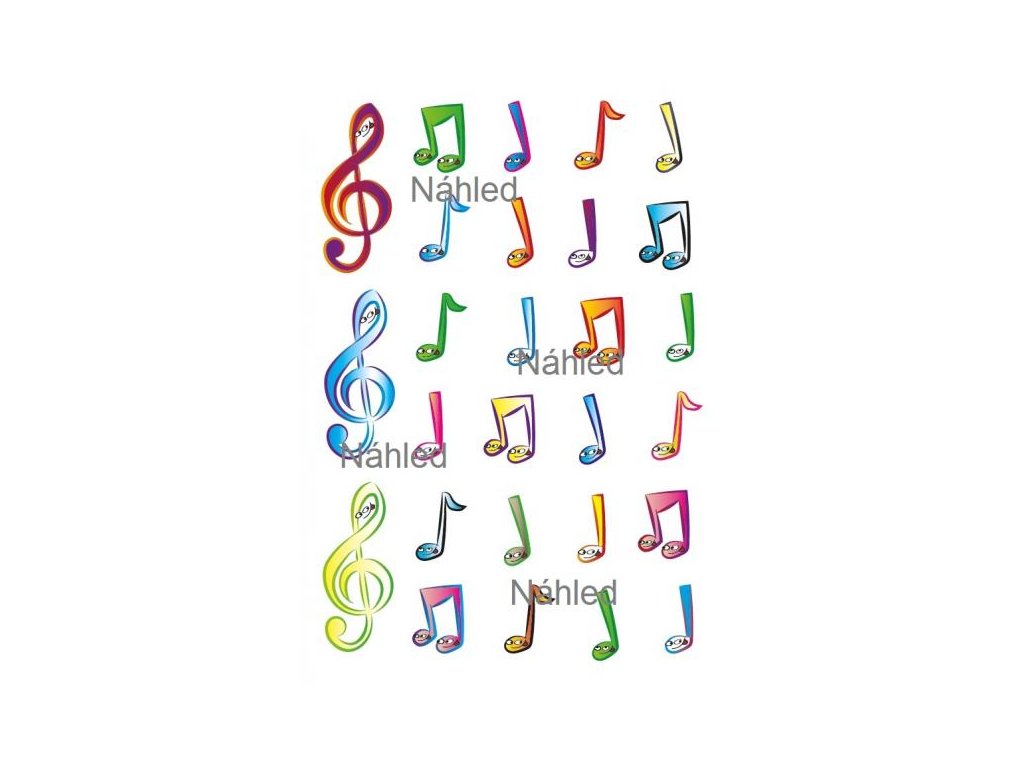 Aršík obsahuje tri husľové kľúče a 24 farebných nôt. Môžete použiť na výzdobu zošitov, blokov alebo pripojiť na hodnotenie do žiackej knižky. Veľkosť aršíku 15x11 cm. Nevhodné pre deti do 3 rokov.