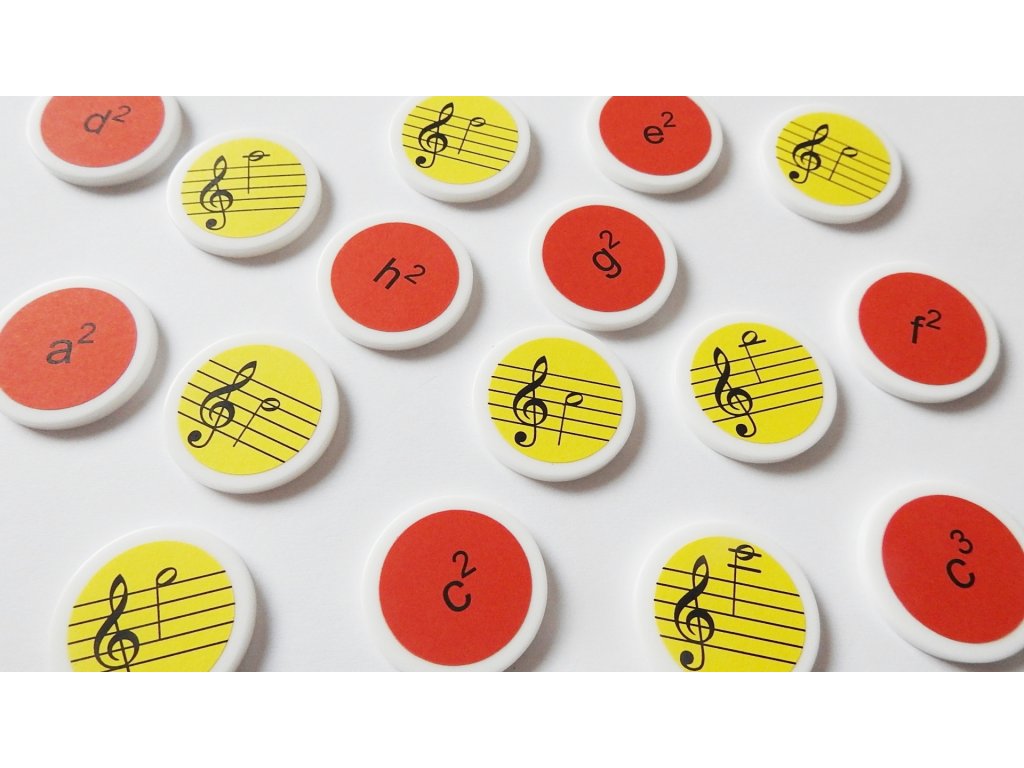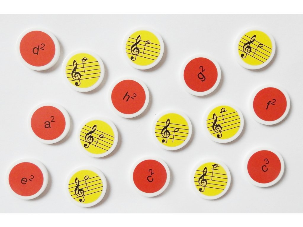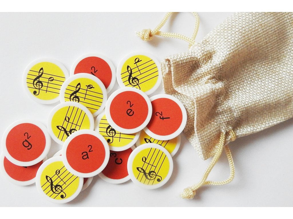 Praktická pomôcka na zapamätanie nôt v husľovom kľúči. Balenie obsahuje celkom 16 koliesok s notami c2-c3 a ich názvami. Balené v zaťahovacom látkovom vrecúšku s hudobným motívom. Priemer kolieska: 3 cm.