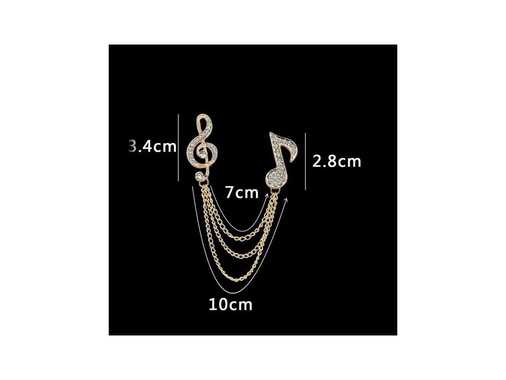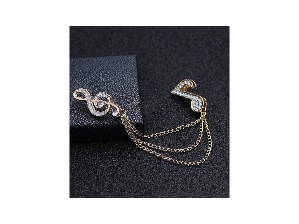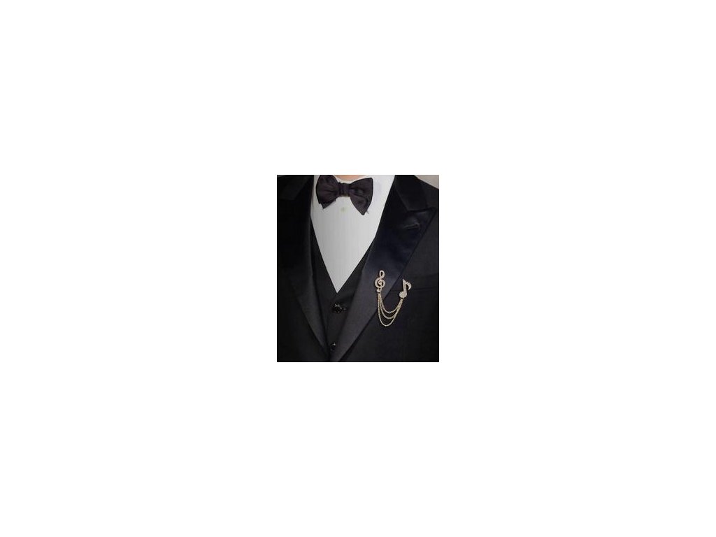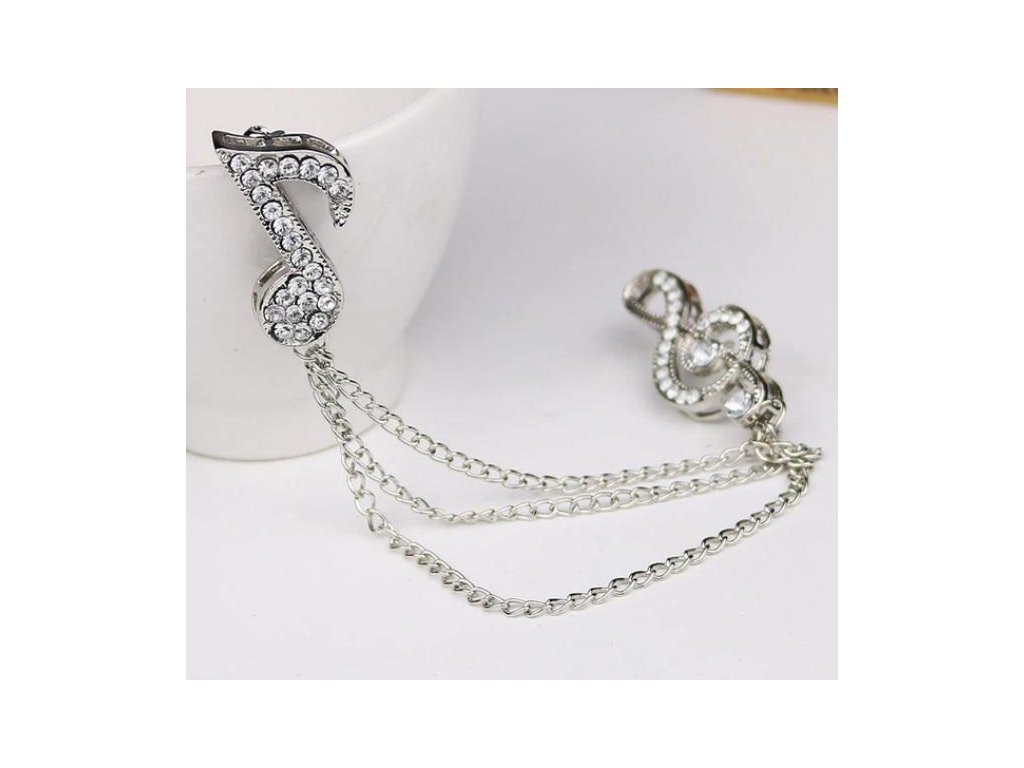 Ozdoba na klopu saka s husľovým kľúčom, notou a retiazkou v striebornej farbe. Výška husľového kľúča 3,4 cm, dĺžka retiazky približne 7 cm. Materiál: zliatina - bižutérny kov