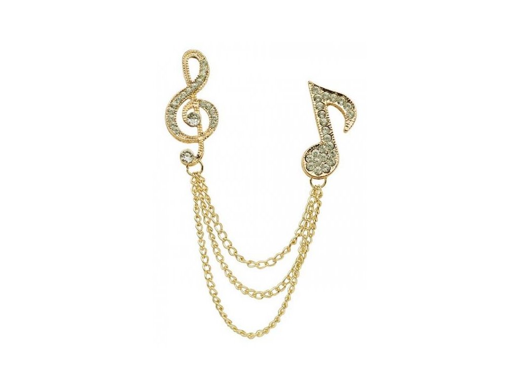Ozdoba na klopu saka s husľovým kľúčom, notou a retiazkou v zlatej farbe. Farba kamienkov je strieborná. Výška husľového kľúča 3,4 cm, dĺžka retiazky približne 7 cm. Materiál: zliatina - bižutérny kov