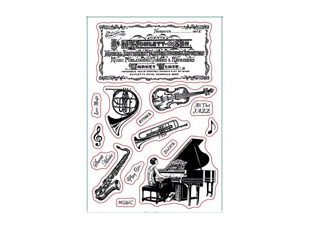 Silikónové pečiatky s motívmi hudobných nástrojov.