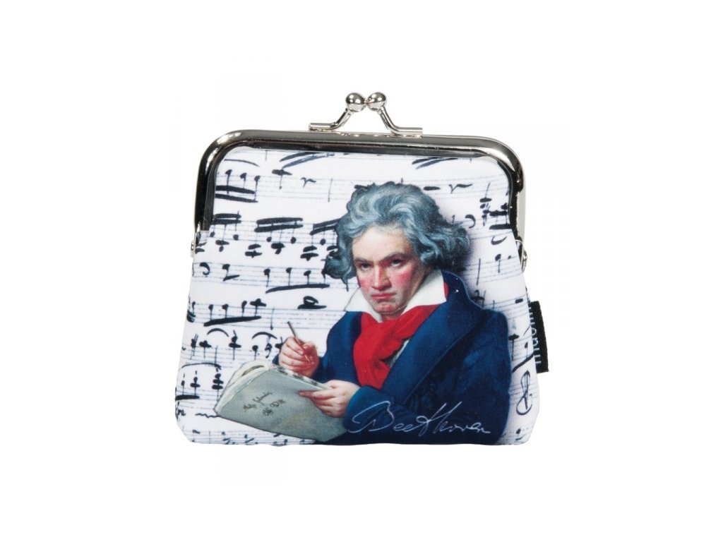 Textilná peňaženka s kovovým zapínaním. Pod vrchnou látkou je tenký molitan a čierna podšívka. Ludwig van Beethoven na portréte od nemeckého maliara Stielera. Rozmer 10,5*3*10 cm.