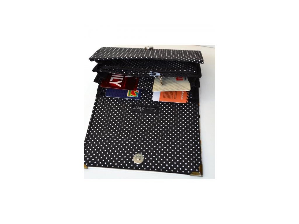 Vnútro rozdelené na 1 zipsové vrecko na mince a 4 voľné vrecká na doklady, papierové peniaze alebo niečo iné. Zmestí sa aj cestovný pas. A do dvoch vreciek sú všité vrecká na karty