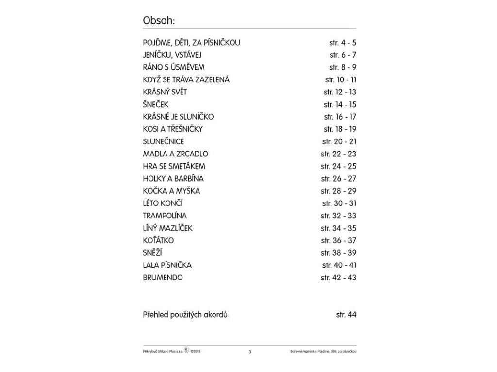Tento spěvník obsahuje pesničky s témami o ročných dobách, prírode, o deťoch i domácich maznáčikoch. V závere čaká na deti melódia, na ktorú si môžu zložiť vlastný text. Ku všetkým pesničkám nájdete obrázok na vymaľovanie alebo rozprávanie o pesničke.