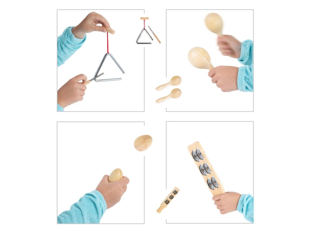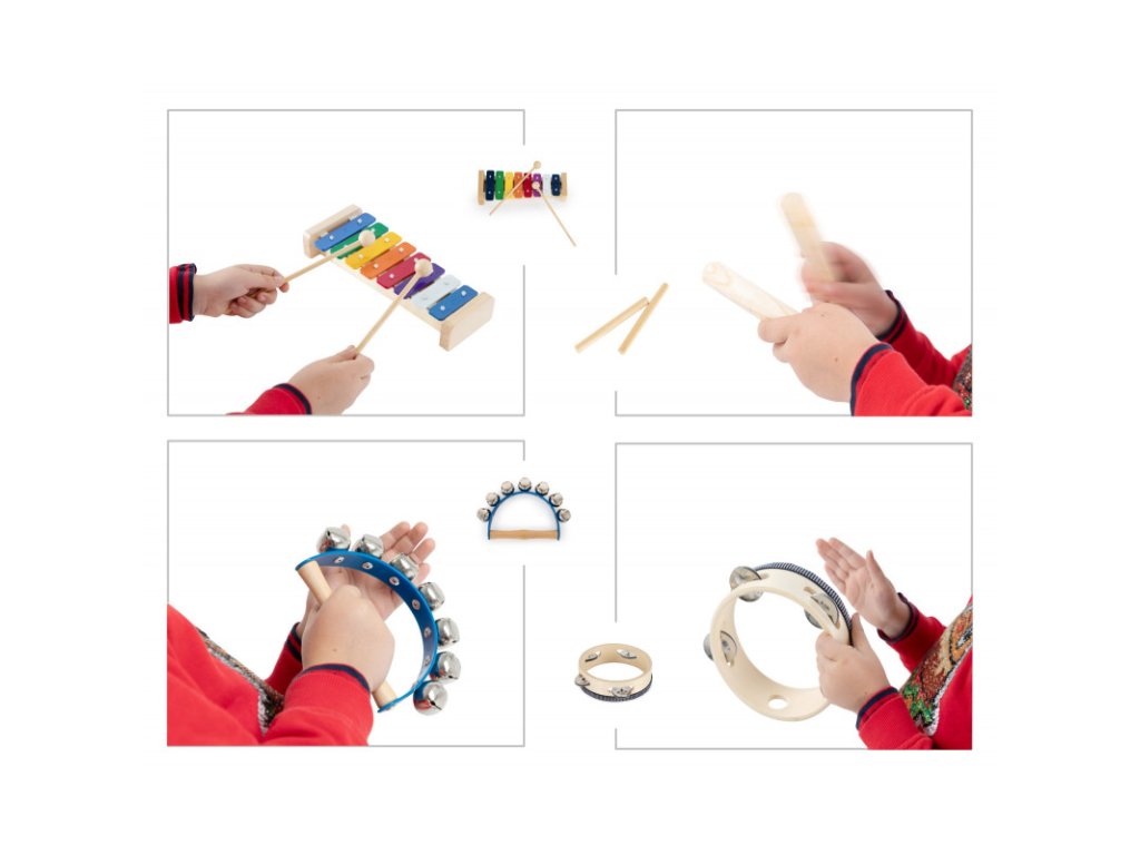 V sete nájdete: Drevenú tamburínu so 4 pármi zvonov (priemer cca 15 cm), 1 pár paličiek s drevenou hlavou, 1 pár ozvučný drievok (dĺžka cca 15 cm), vajcia - shaker, diatonickú zvonkohru C dur s farebnými kameňmi, jingle stick sa 6 triangel s kovovými paličkami, 1 pár Maracas (dĺžka cca 15,5 cm) a 1x rolničky, prepravná taška.
