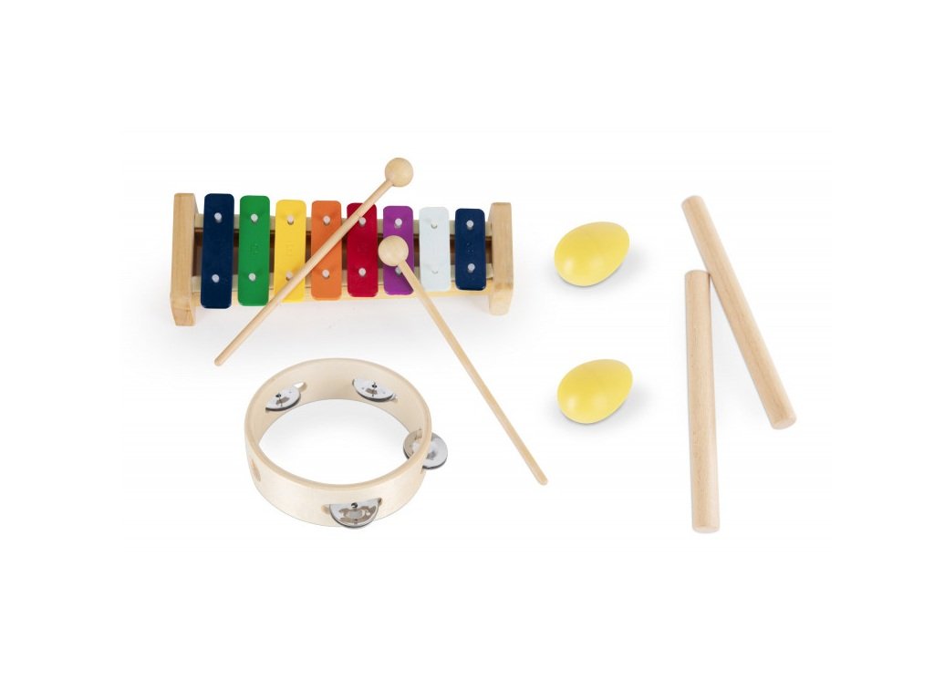 Táto sada pre deti zahŕňa široký výber hudobných nástrojov. Či už je to v škôlke, v hudobnej výchove alebo jednoducho doma. Hranie s rytmickými nástrojmi nielen podporuje rozvoj detí, ale prináša aj veľa zábavy. Celkom 4 rôzne hudobné nástroje čakajú na preskúmanie. Okrem ozvučných drievok a tamburíny sa v sete nachádzajú aj vajíčka (shaker) a dokonca aj zvonkohra.