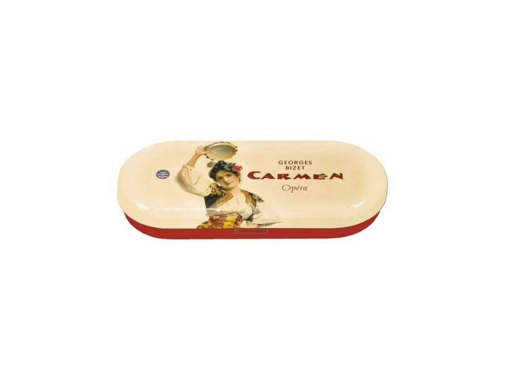 Pevné plechové puzdro, ktoré ochráni vaše okuliare pred poškodením, so semišovou vložkou vo vnútri. S motívom plagátu k opere Carmen z roku 1896. Rozmer 16*6,6*2,8 cm.