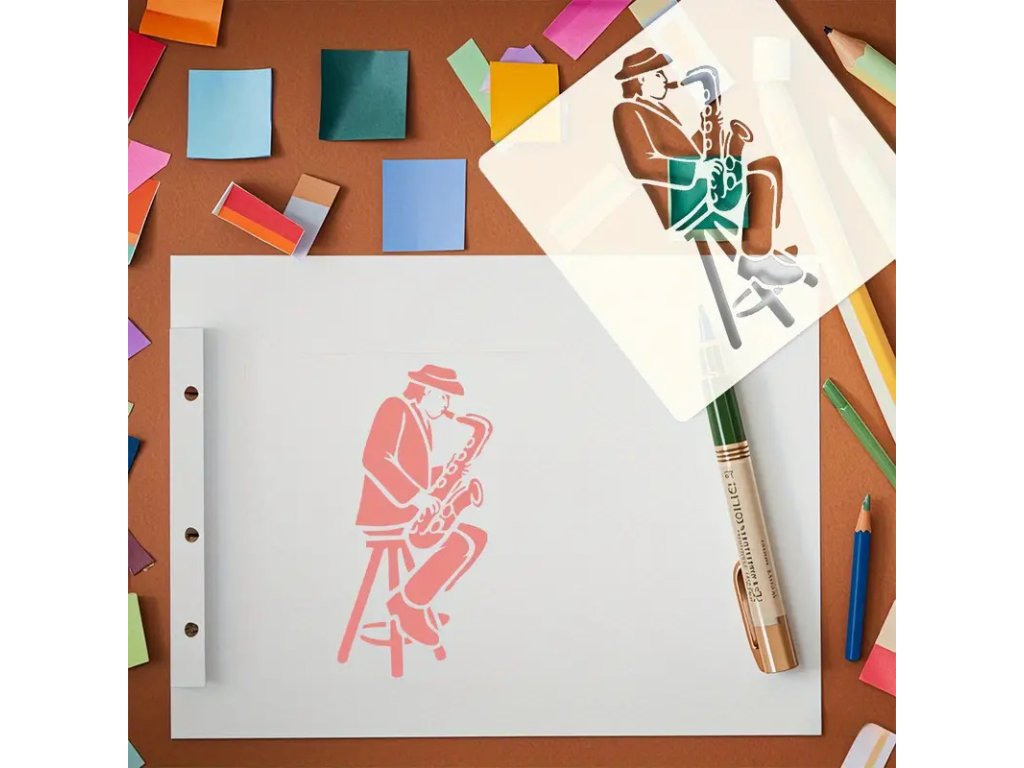 Šablóna s motívom saxofonistu pre umelecké projekty a kreatívne tvorenie.