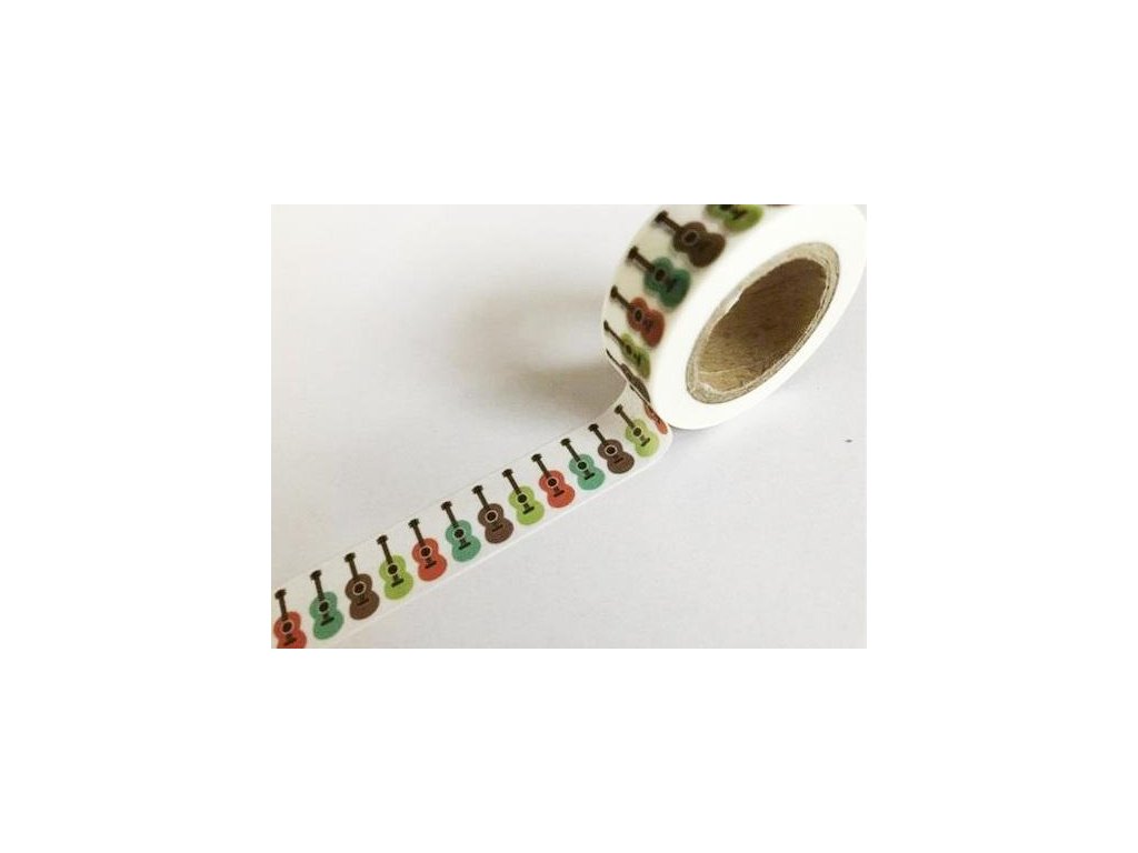 Samolepiaca páska s motívom farebných gitár, šírka 1,5 cm, dĺžka 10 m. Šírka 1,5 cm, dĺžka 10 m.