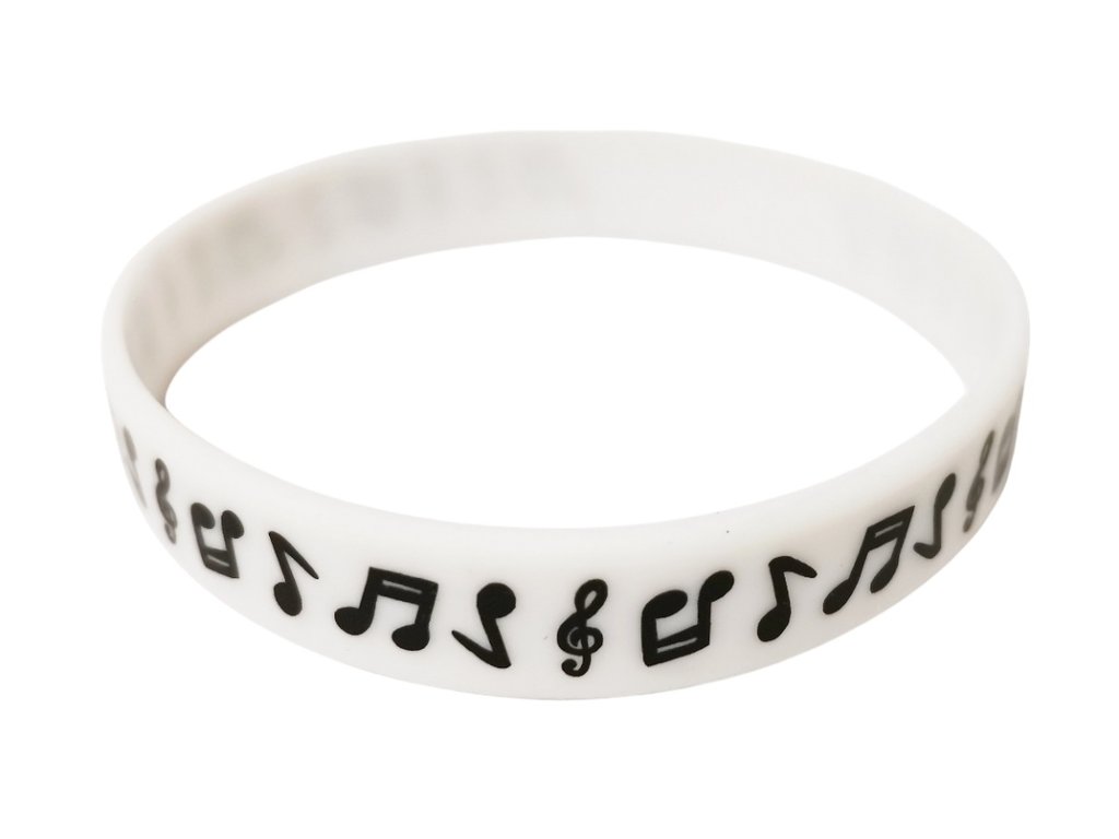Silikónový náramok s hudobnými symbolmi biely s čiernou potlačou.