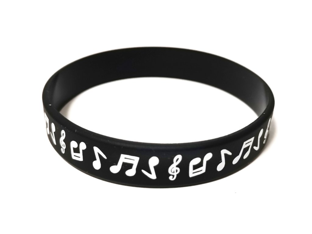 Silikónový náramok s hudobnými symbolmi čierny s bielou potlačou.
