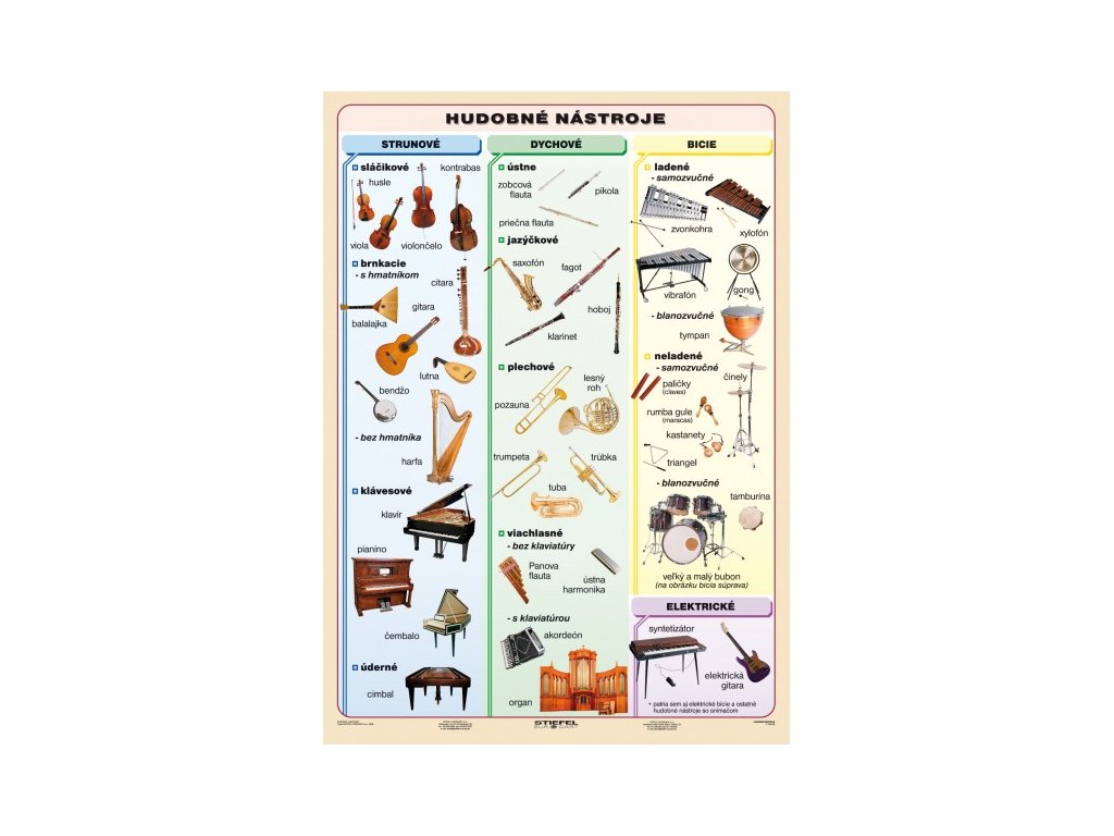 Naučná tabuľka o triedení hudobných nástrojov. Obojstranná tabuľka pomáha žiakom orientovať sa v hudobných nástrojoch, rozpoznávať ich a triediť podľa charakteristických znakov.