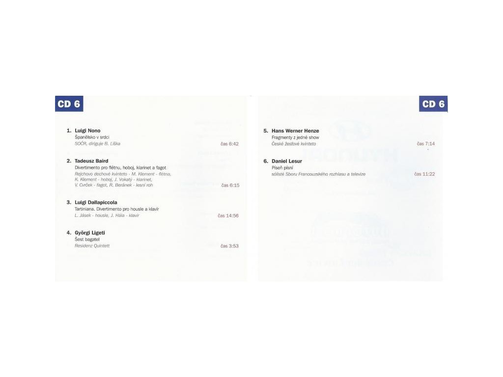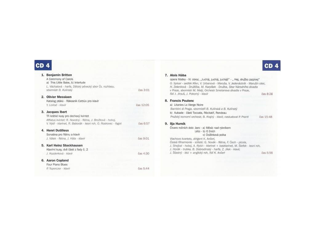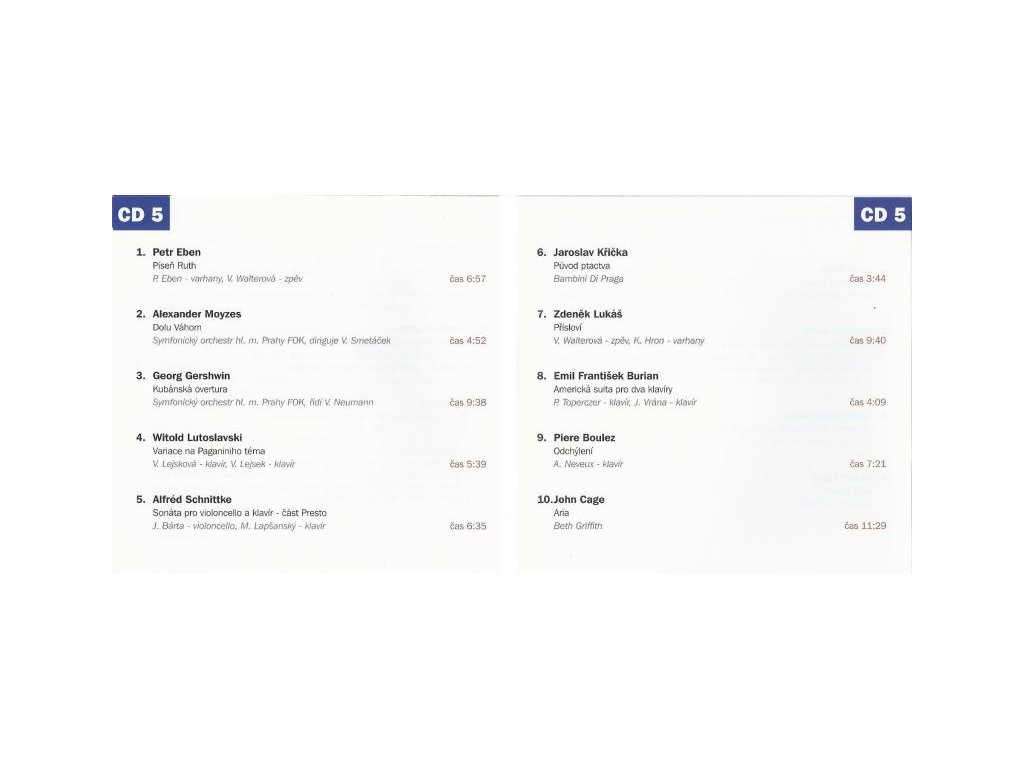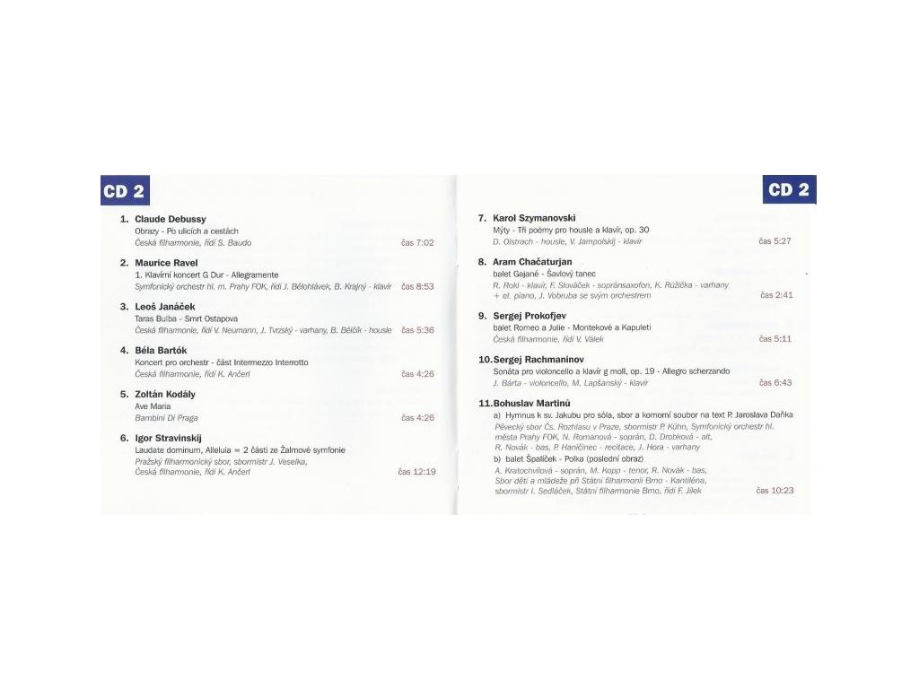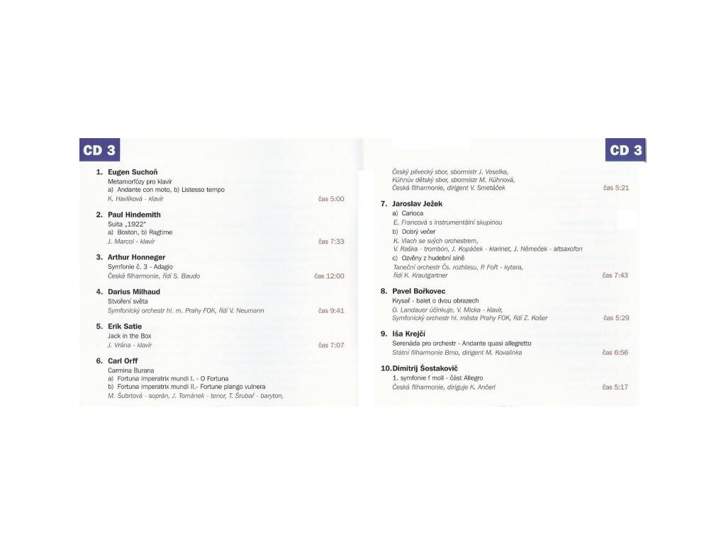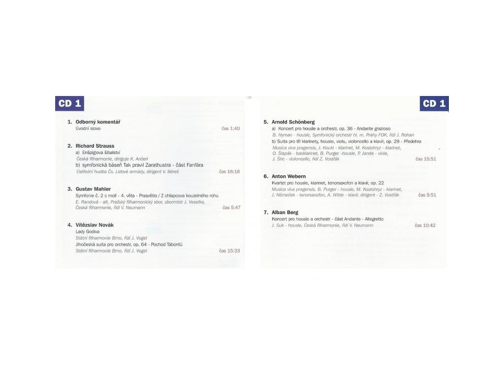 Na CD nájdete ukážky týchto skladateľov: Richard Strauss, Víťazslav Novák, Arnold Schönberg, Anton Webern, Alban Berg, Claude Debussy, Maurice Ravel, Leoš Janáček, Bela Bartók, Zoltán Kodály, Igor Stravinskij, Karol Szymanovski, Aram Chačaturjan, Sergej Prokofjev, Serg Suchoň, Paul Hindemith, Arthur Honneger, Darius Milhaud, Erik Satie, Carl Orff, Jaroslav Ježek, Pavol Bořkovec, Iša Krejčí, Dimitrij Šostakovič, Benjamin Britten, Yves Baudrier, Olivier Messiae, Jacques Ibert, Henri Dutilleux, Gustav Mahler, Alois Hába, Francis Poulenc, Ilja Hurník, Peter Eben, Alexander Moyzes, Ján Cikker, Georg Gershwin, Witold Lutoslavski, Krysatof Penderecki, Alfréd Schnittke, Jaroslav Krička, Zdeněk Lukáš, Emil František Burian, Piere Boulez Baird, Luig Dallapiccola, Liget Györgi, Hans Werner Henz, Daniel Lesur, André Jolivet.