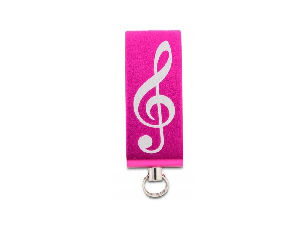 USB Flash disk mini – 32 GB s gravírovaným husľovým kľúčom. S otočnou krytkou. USB 2.0 Rozmery: 3,8 x 1,2 x 0,6 cm Materiál: plast + kov Farba: ružová