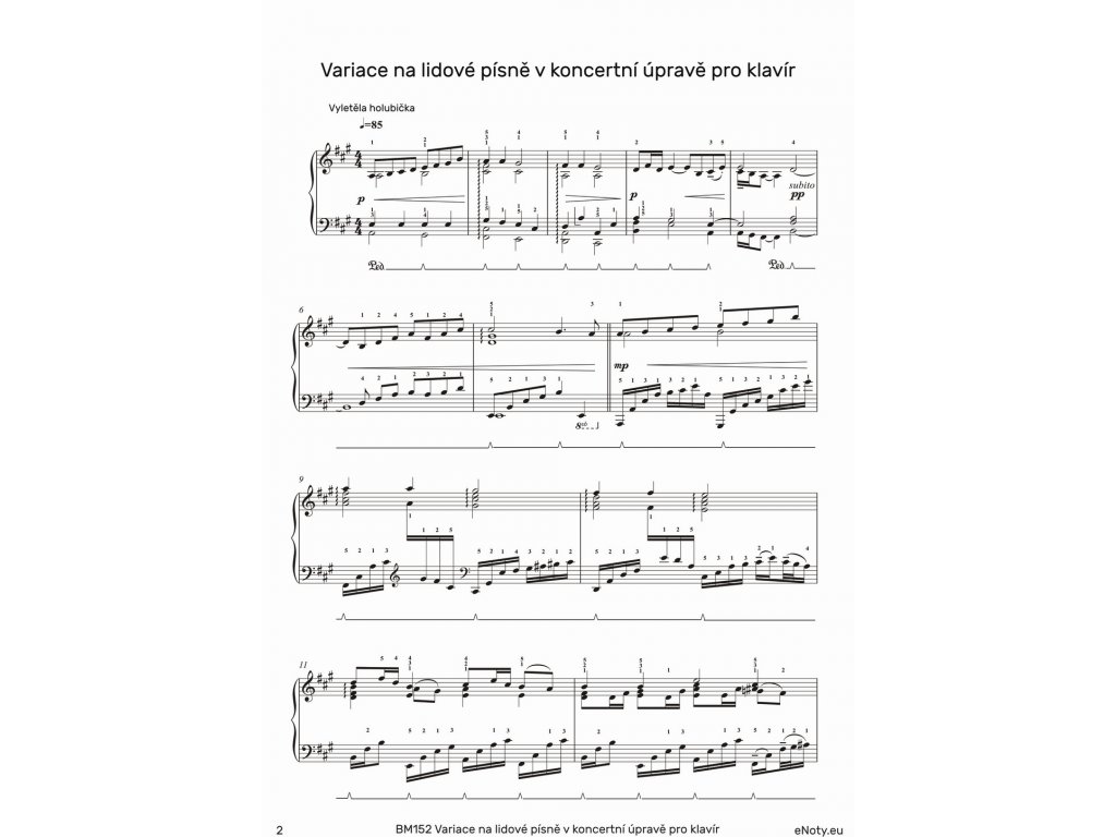 Tento zošit Vám prináša krásnu koncertnú variáciu na päť známych ľudových piesní (Vyletela holubička / Prší, prší / Lúčenie, lúčenie / Ej, lásko, lásko / Tečie voda, tečie) v aranžmáne pre stredne a viac pokročilých klaviristov. Skladba je vhodná pre klavírne a absolventské koncerty, pre súťaže, klavírne recitály aj pre hranie sa doma len tak pre radosť