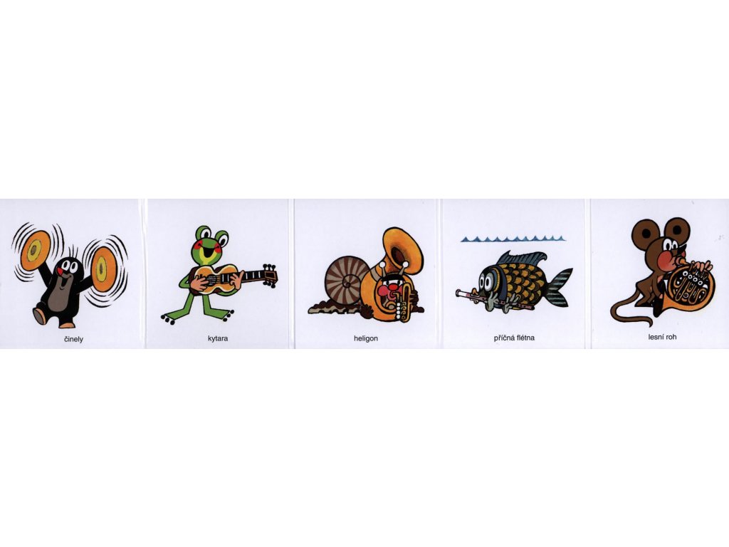 Obľúbené leporelo - kocka o 14 ilustráciách. Krtko, jeho kamaráti myška, zajačik, ježko a zvieratká z lúča sa chopili hudobných nástrojov. Deti sa zoznámia s husľami, basou, harmonikou, činelmi a rôznymi dychovými nástrojmi. Celý cyklus vtipne uzatvára bocian dirigent.